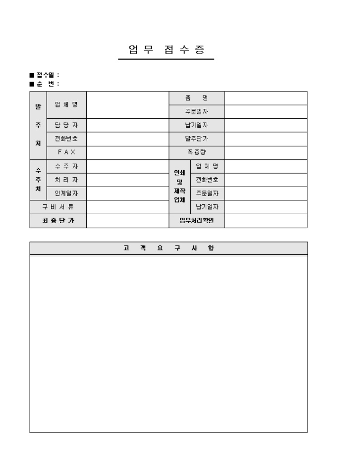 9,000원/월인쇄업체에서 사용할 수 있는 업무 접수증입니다. 발주처, 수주처, 최종단가, 고객요구사항 등의 항목으로 구성되어있습니다.