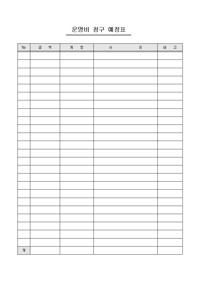 9,000원/월예정된 운영비 청구 내용을 기록/ 관리할 수 있는 운영비 청구 예정표입니다. 금액, 계정, 사유 등의 항목으로 구성되어있습니다.