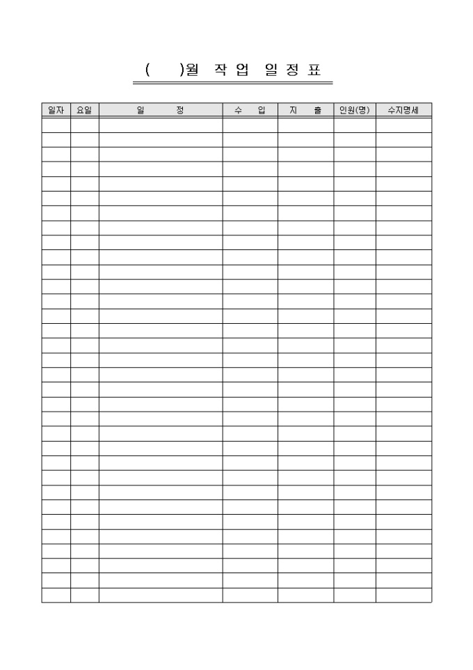 작업일정을 간단하게 작성 및 요약할 수 있는 작업일정표입니다. 일자, 요일, 일정, 수입, 지출 등의 항목으로 구성되어있습니다.