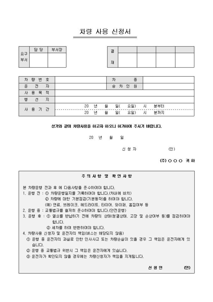 차량 사용을 신청할 때 사용할 수 있는 차량 사용 신청서입니다. 차량번호, 운전자, 사용목적, 행선지 등의 항목으로 구성되어있습니다.