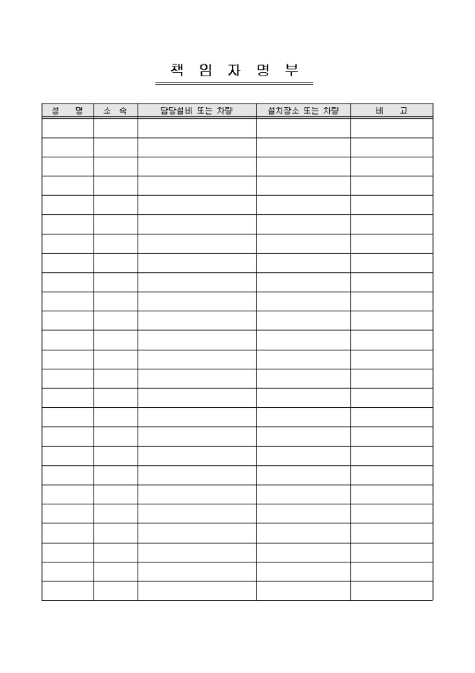9,000원/월설비 책임자 명단을 기록/ 관리할 수 있는 책임자명부입니다. 성명, 소속, 담당설비 또는 차량 등의 항목으로 구성되어있습니다.
