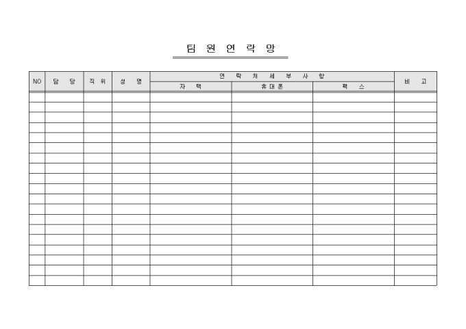 팀원의 연락처 등을 기록/ 관리할 수 있는 팀원 연락망입니다. NO, 담당, 직위, 성명 등의 항목으로 구성되어있습니다.
