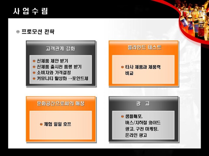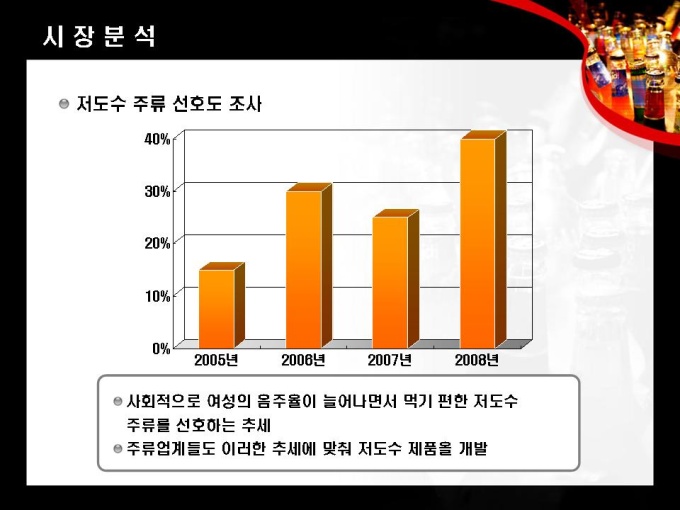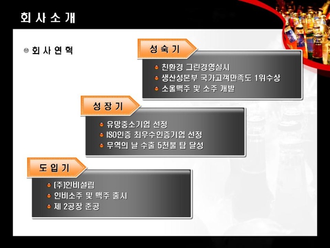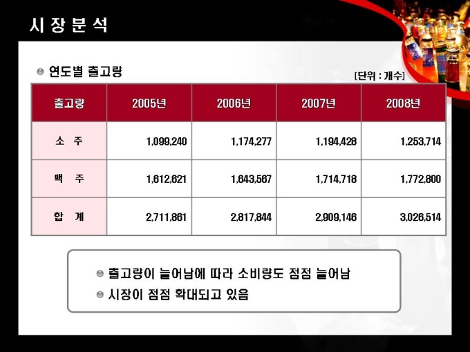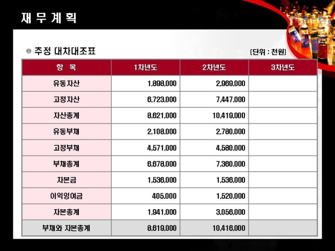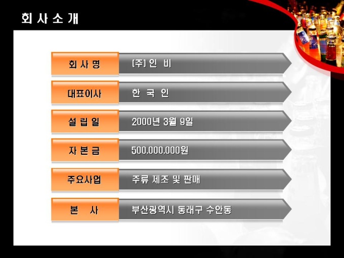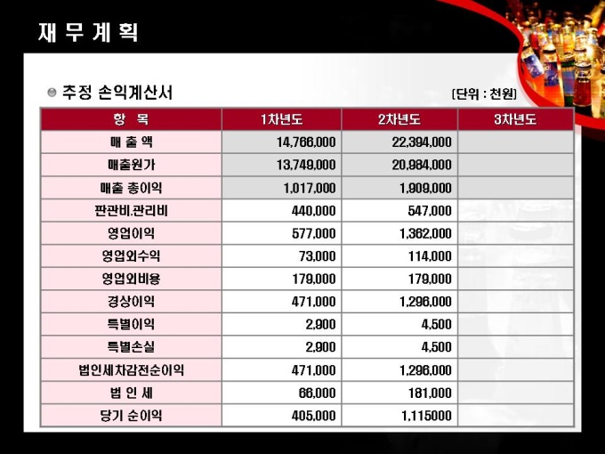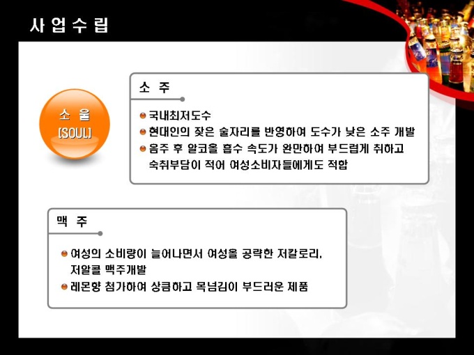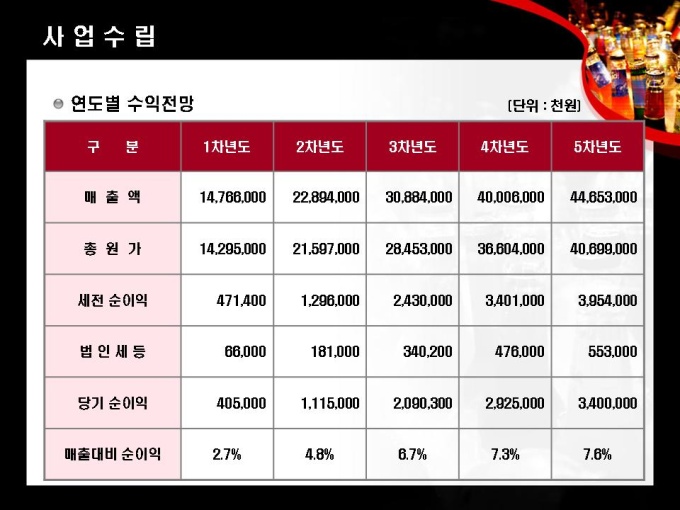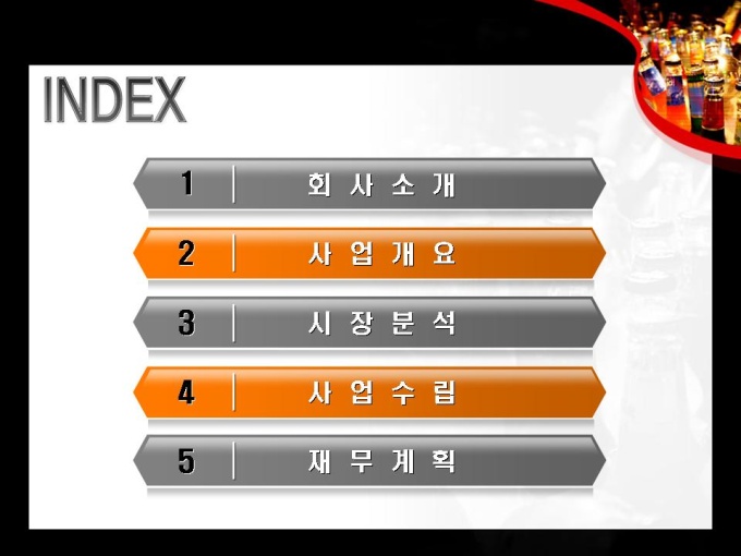 주류회사에서 신제품을 개발하는 사업계획서입니다. 목차는 1.회사소개 2.사업개요 3.시장분석 4.사업수립 5.재무계획으로 구성되어 있습니다.