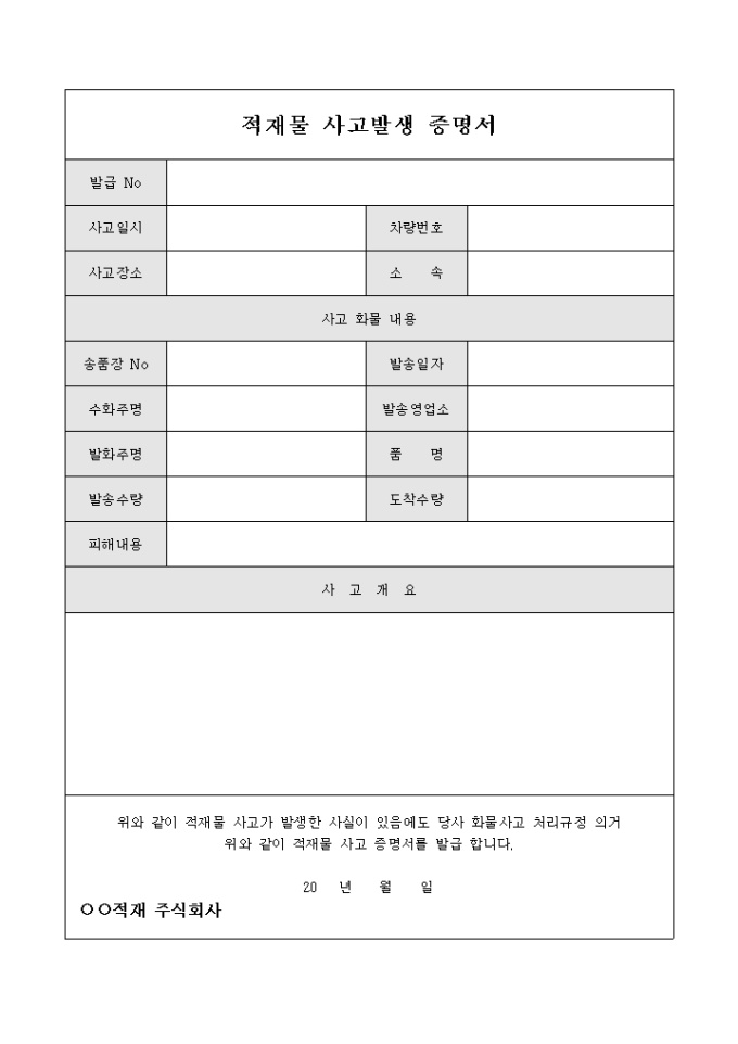 적재물 사고발생시 사고화물 내용 및 사고개요등을 증명하기 위해 사용하는 문서입니다.