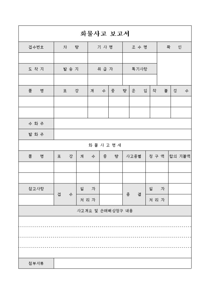 화물 배달시 일어난 사고에 대하여 사고 내용 및 화물사고 명세등을 기록하여 보고시 사용하는 문서 입니다.