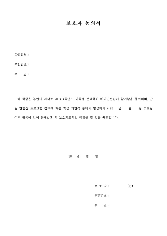 9,000원/월대학생 전액 국비 해외인턴십에 참가함을 동의하며, 만일 프로그램 참여에 따른 학생 개인적 문제가 발생하거나 귀국에 문제발생시 보호자로서 책임을 질것을 확인한다는 내용의 동의서입니다.