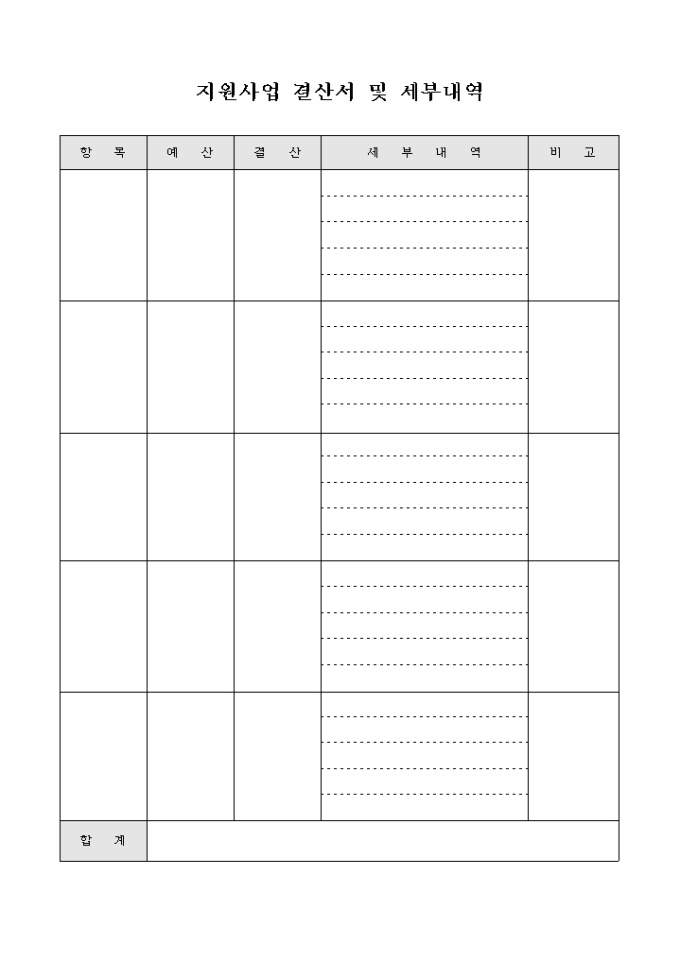 9,000원/월지원사업의 결산과 세부내역을 기록하고자 할 때 사용하는 서식으로 항목에 따른 예산과 결산액 및 세부 내역을 작성합니다.