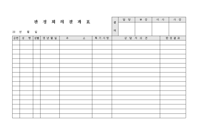 판정회의 후 그 결과 및 내역에 대해서 기록할 수 있도록 제작된 서식으로 해당자의 인적사항과 상담자 의견 및 판정결과를 기록합니다.
