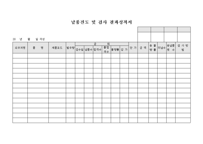 납품 진도 및 검사 결과 성적서 양식으로 외주처명과 제품코드 및 금회 내용 등의 항목을 기록합니다.