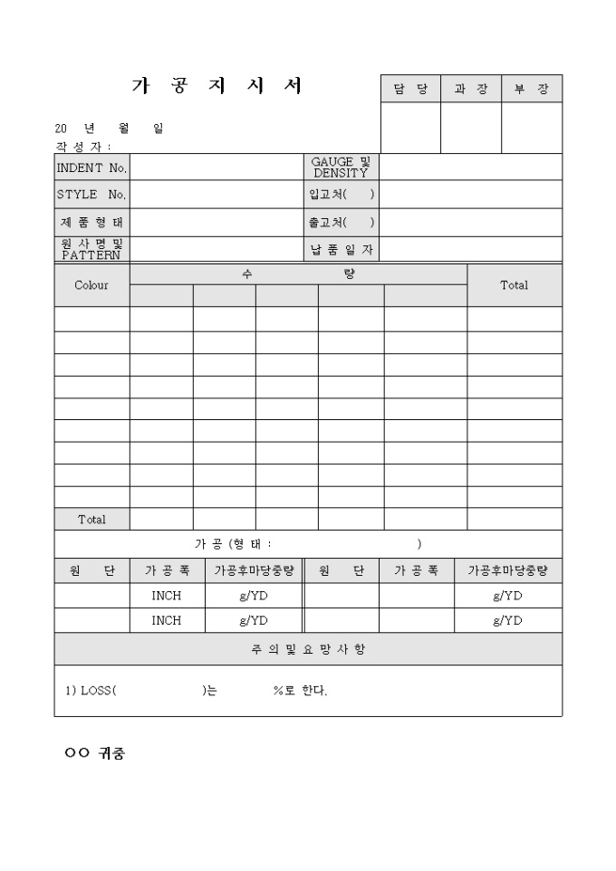 원단 가공지시를 할 때 사용하는 서식으로 제품의 형태 및 가공시 주의사항 등을 기록합니다.