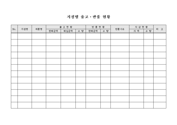 지점별로 제품을 판매하여 출고한 현황 및 제품의 불량 등의 사유로 반품된 현황 등을 기재할 수 있는 지점별 출고·반품 현황 양식입니다. 각 지점명과 판매한 제품명, 출고현황, 반품현황, 반품사유 등의 내용을 기재할 수 있습니다.