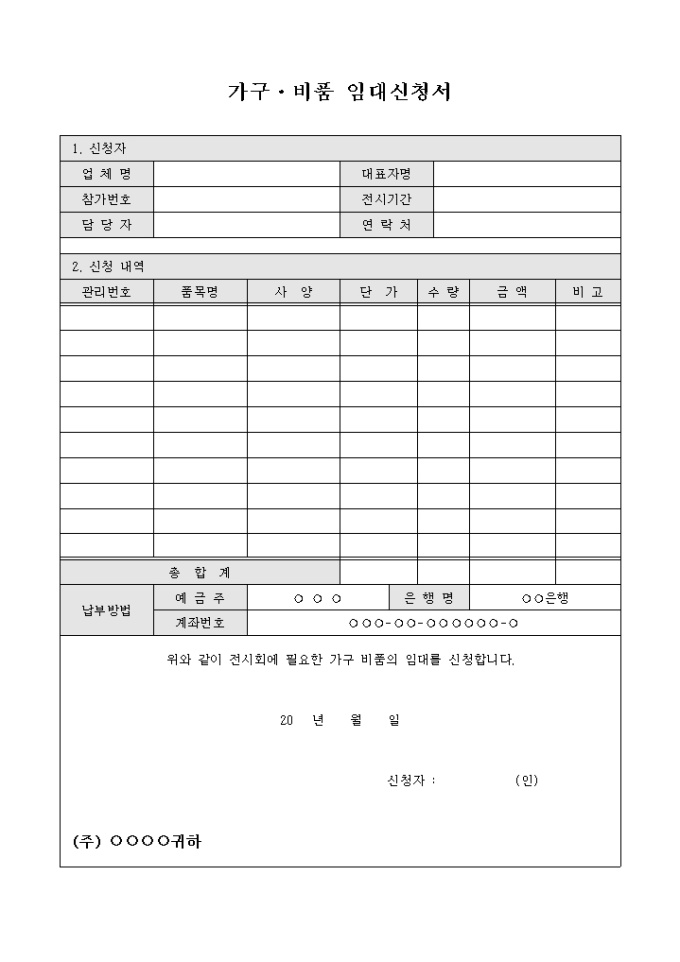 9,000원/월전시회에 참가한 업체가 전시회에 사용되는 가구 및 비품의 임대를 신청하기 위해 작성하는 가구·비품 임대신청서 양식입니다.