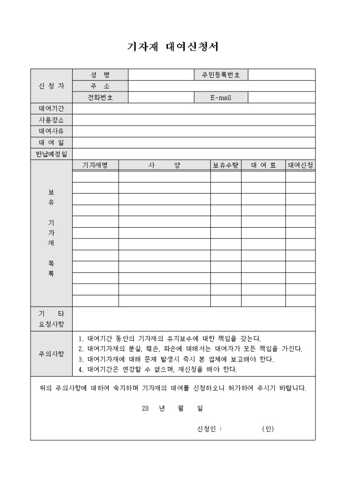 기자재 등을 대여하는 업체에게 필요기자재의 대여를 신청하는 기자재 대여신청서 양식입니다. 신청자의 인적사항과 대여기간, 대여일, 반납예정일, 보유 기자재 목록 등의 항목으로 구성되어 있습니다.