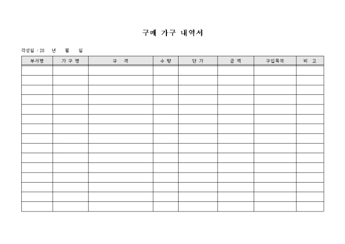 9,000원/월회사의 부서별로 구입한 가구 내역을 기록하는 내용의 구매 가구 내역서 양식입니다. 부서명과 구매한 가구명, 규격, 수량, 단가, 금액, 구입목적 등을 기재할 수 있습니다.