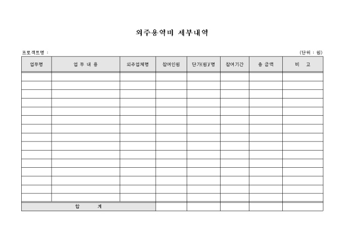 9,000원/월회사에서 진행하는 프로젝트에 참여한 외주업체에게 직급하는 외주용역비에 대한 세부내역을 기록하는 외주용역비 세부내역 양식입니다.