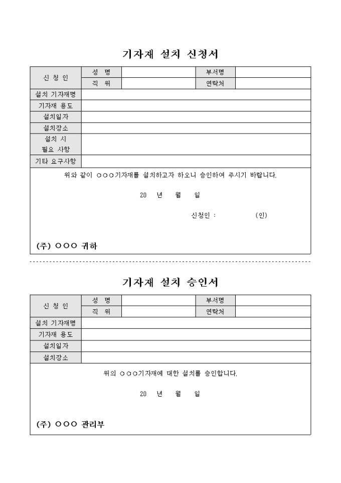 9,000원/월회사의 업무에 필요한 기자재의 설치를 신청하는 내용의 기자재 설치 신청서와 기자재의 설치를 승인하는 내용의 기자재 설치 승인서 양식입니다.