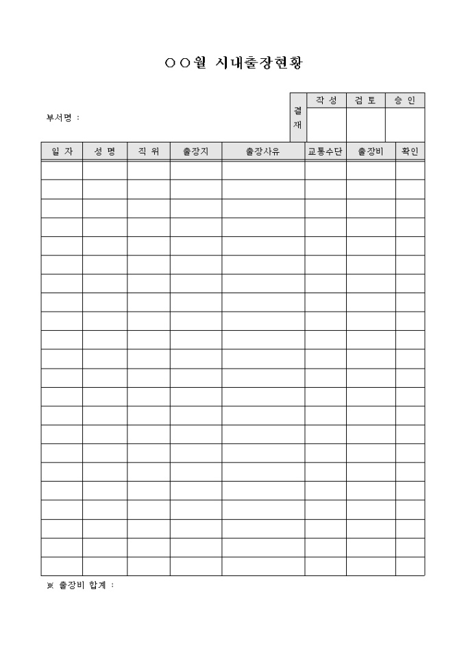9,000원/월해당 부서의 월간 시내출장 현황을 기록하는 시내출장 현황 양식입니다. 해당 부서명과 출장자의 성명, 직위, 출장지, 출장사유, 교통수단, 출장비 등의 항목으로 구성되어 있습니다.