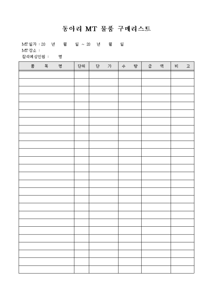 9,000원/월동아리에서 MT를 실시하고자 할 때 사전에 준비해야 할 물품에 대하여 정리, 확인하고자 할 때 사용할 수 있도록 제작된 서식입니다.