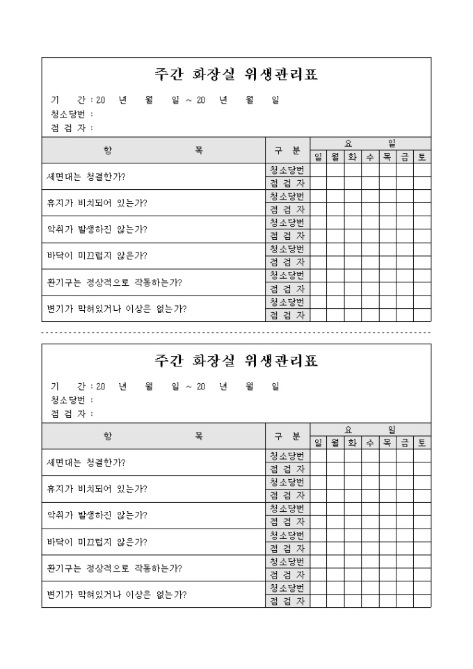 9,000원/월화장실 위생상태와 관련하여 주간 청소 실시여부를 체크하고 이에 대하여 점검자가 확인 / 체크할 수 있도록 만들어졌으며 2등분으로 구성된 서식입니다.
