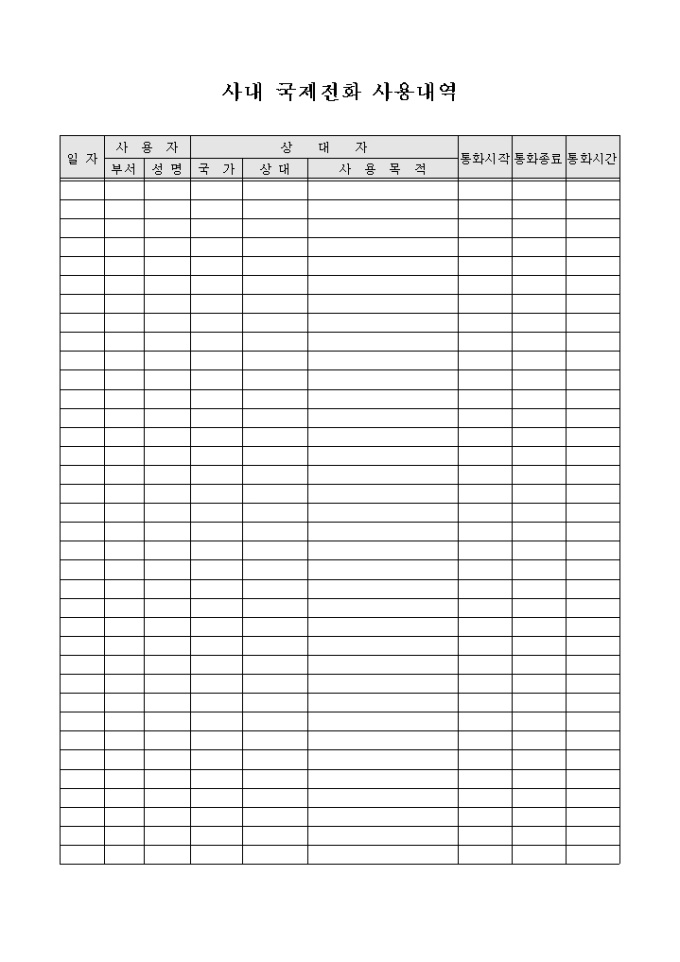 9,000원/월사내에서 어떠한 사유로 인하여 국제전화를 이용하여야 할 경우 사용자 및 상대방 정보, 통화내용을 간략하게 기입하며 통화시간 등을 기입할 수 있게끔 제작된 서식입니다.