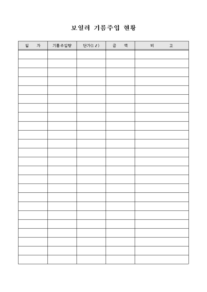 9,000원/월가정에서 사용하는 기름 보일러에 기름을 주입한 현황을 관리하고자 할 때 사용할 수 있도록 만들어졌으며 일자별 주입량 및 리터당 금액 등을 기입할 수 있게끔 제작된 서식입니다.