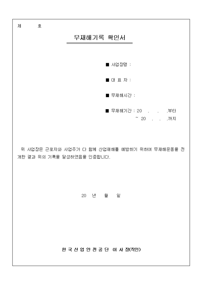 9,000원/월근로자와 사업주의 무재해운동 기록 달성을 인증한다는 내용의 무재해기록 확인서입니다.