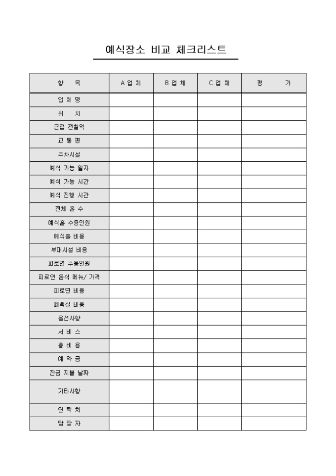 결혼 예식장소 비교 시 관련 내용을 기록하여 확인할 수 있는 예식장소 비교 체크리스트입니다. 업체명, 위치, 교통편, 주차시설 등의 항목으로 구성되어있습니다.