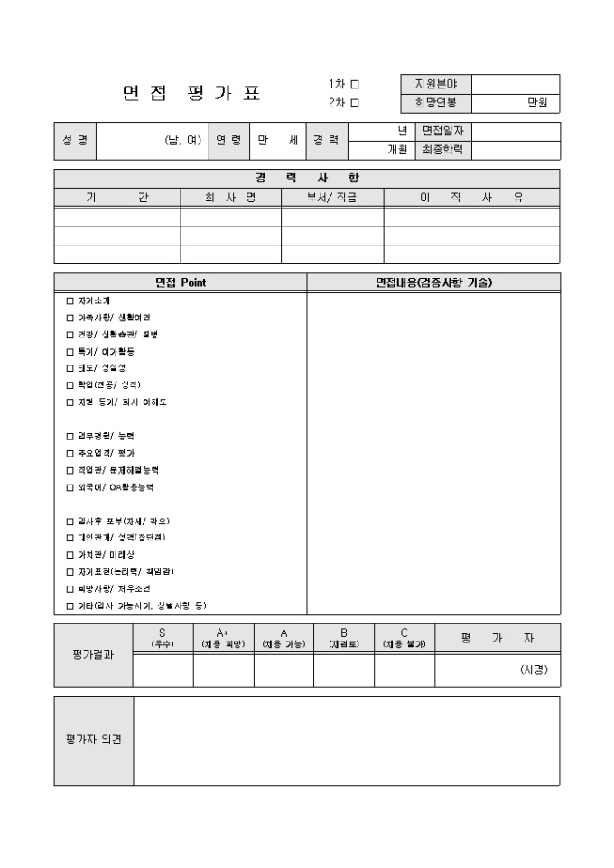 9,000원/월채용 선발과정의 면접시에 사용할 수 있는 면접 평가표입니다. 경력사항, 면접 포인트, 면접내용 등의 항목으로 구성되어있습니다.