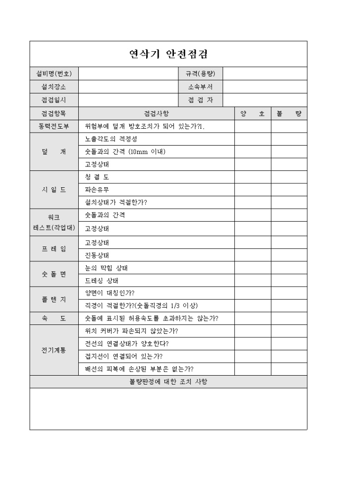 9,000원/월연삭기 안전점검표 입니다. 연삭기의 점검사항에 따른 결과를 기록 하여 관리 할 수 있습니다.