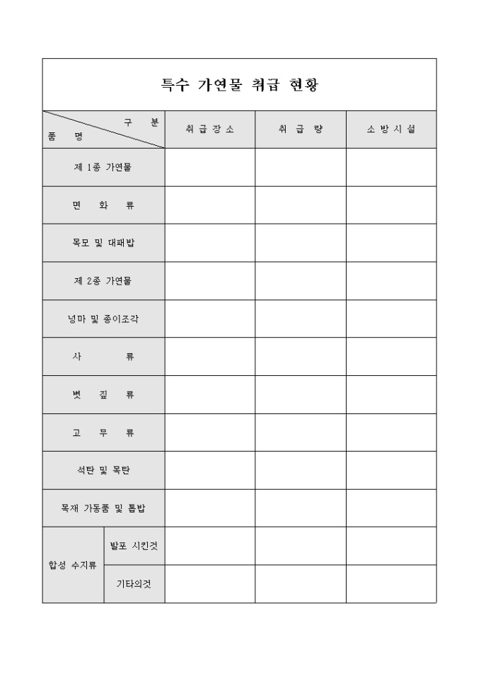 9,000원/월특수 가연물 취급현황 입니다. 취급장소, 취급량, 소방시설로 구분하여 기록 할 수 있습니다.
