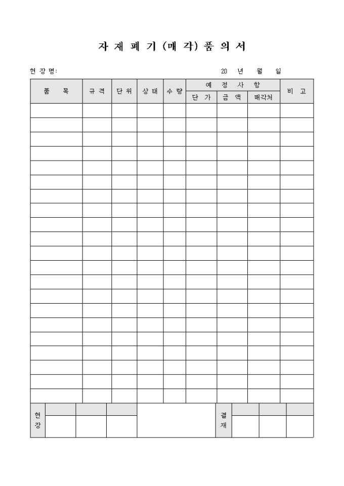 9,000원/월자재 폐기 및 매각 품의서 양식으로 품목의 정보와 예정사항을 기록할 수 있도록 제작되었습니다.