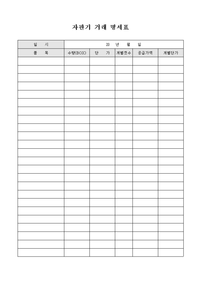 9,000원/월자판기 거래 내역에 대해서 기록할 수 있도록 제작된 서식으로 품목과 수량, 단가, 개별 개수 등을 기록합니다.
