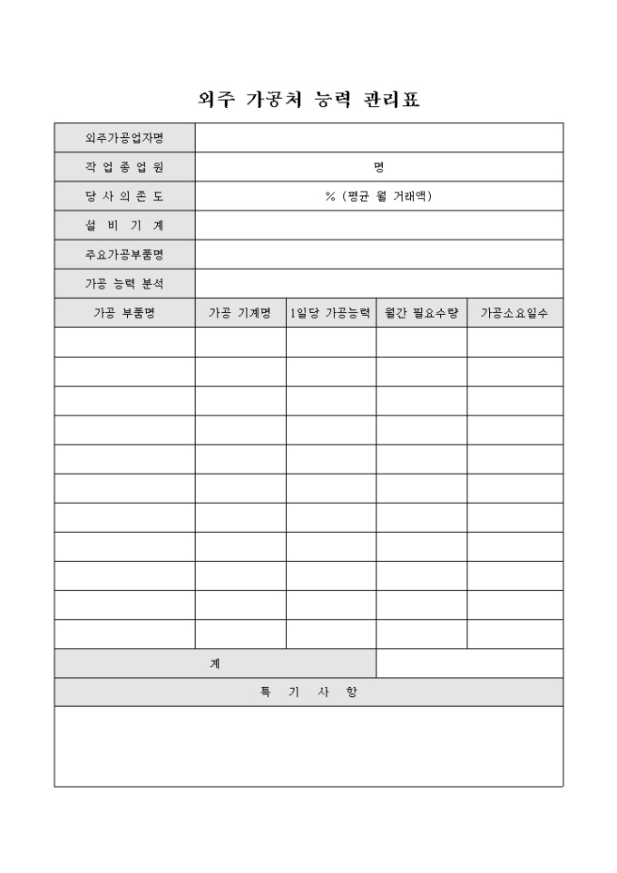 9,000원/월외주 가공처 능력 관리표 양식으로 외주가공 업자명과 의존도 및 가공 푸품명 및 가공능력 등의 항목을 구성하고 있습니다.