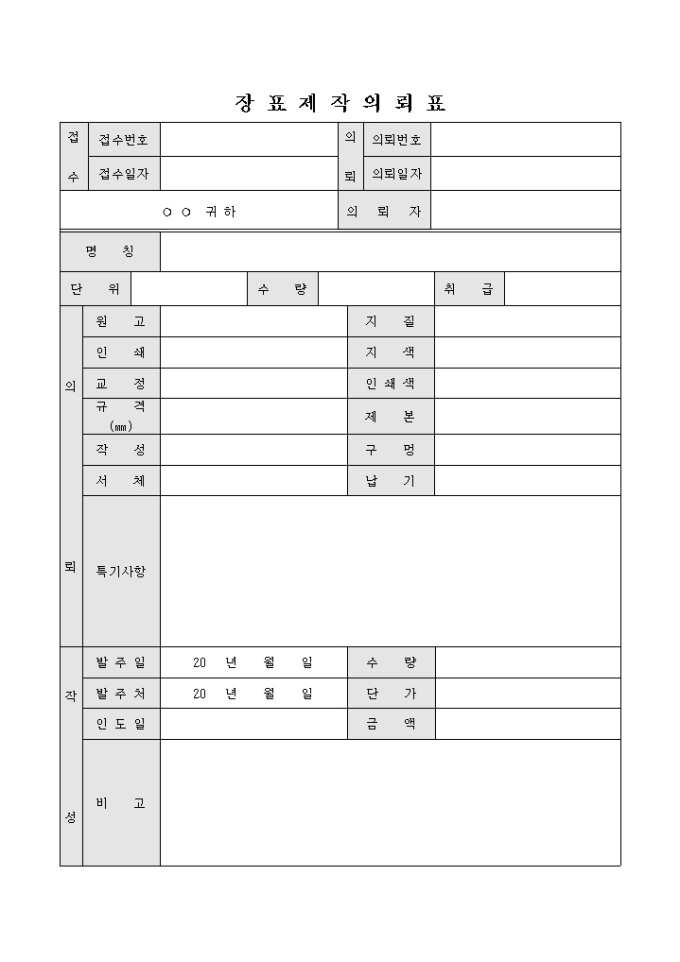 9,000원/월장표 제작을 의뢰하고자 할 때 사용하는 서식으로 접수정보와 의뢰정보 및 의뢰 특이사항 등을 기록합니다.