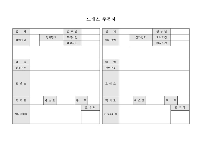 9,000원/월결혼식을 준비할 때 웨딩드레스 주문시 사용하는 서식으로 업체와 메이크업 및 턱시도, 드레스, 부케 등을 기록합니다.