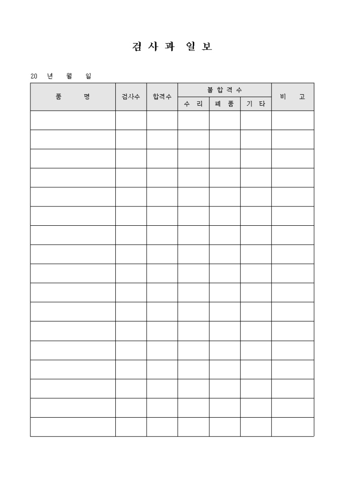 검사과 일보 양식으로 품명과 검사수 및 합격수와 불합격수 등의 항목을 기록합니다.