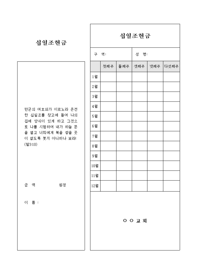 9,000원/월십일조 헌금 내역을 기록 할 수 있도록 제작된 서식으로 월별로 기록합니다.