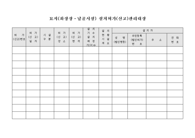 묘지(화장장, 납골시설)의 설치 허가(신고) 내역에 대해서 관리하기 편리하도록 제작된 서식입니다.