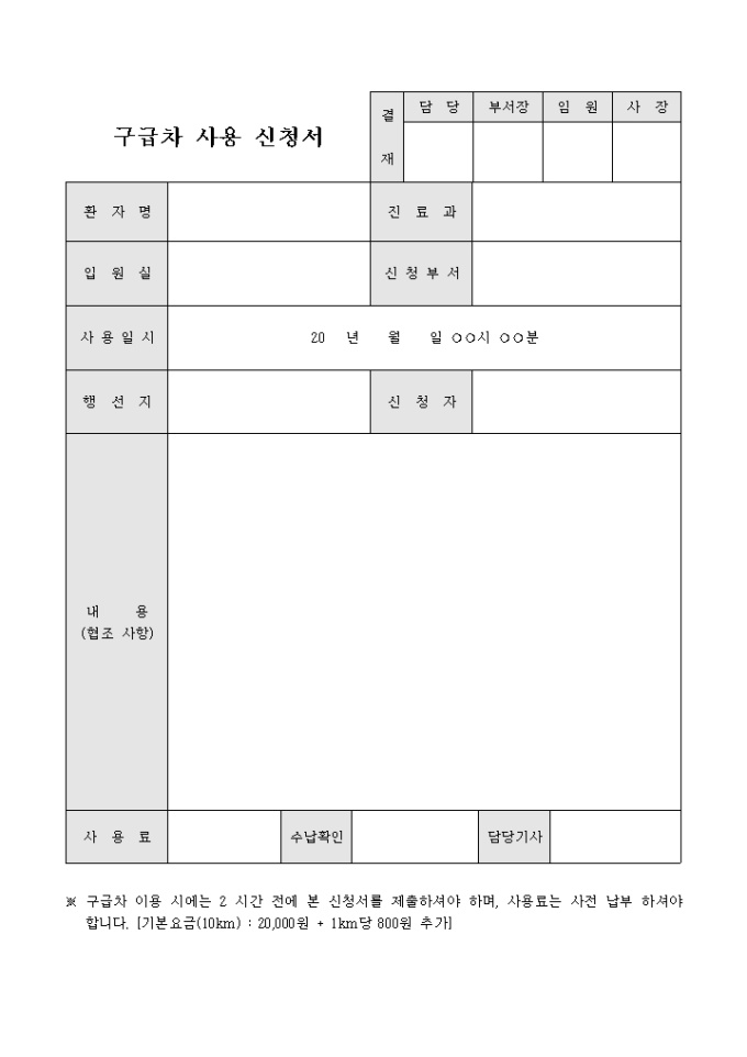 9,000원/월구급차 사용 신청서 양식으로 환자명과 진료과 및 행선지와 협조사항 등을 기록하여 사용을 신청합니다.