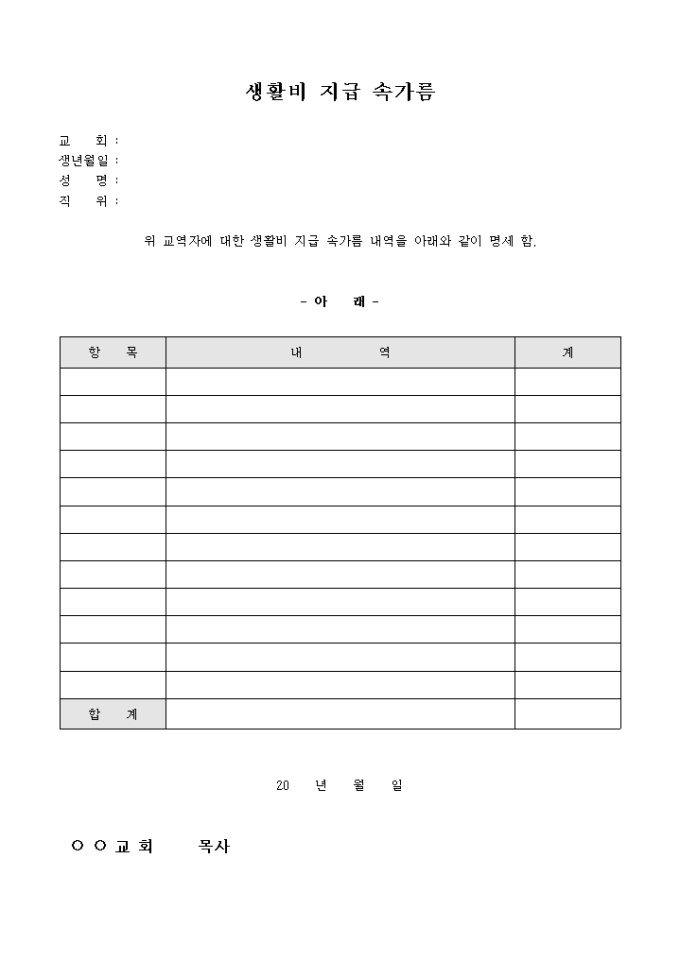 9,000원/월교회에서 사용하는 교역자에 대한 생활비 지급 속가름 내역서 양식으로 항목에 따른 내역과 계를 기록하여 명세합니다.