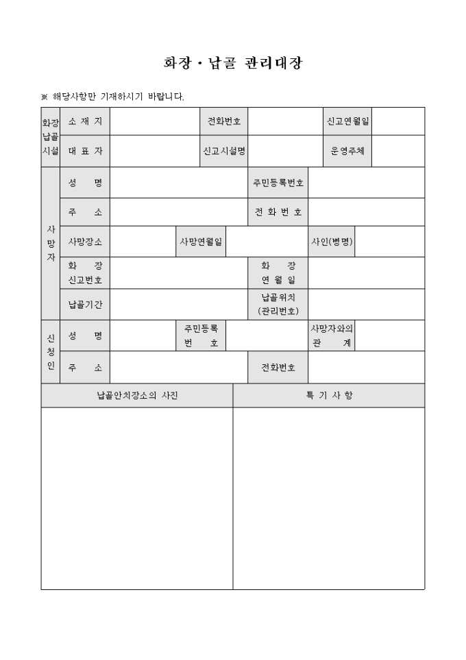 화장 및 납골에 관한 사항을 효율적으로 관리 할 수 있도록 제작된 서식으로 시설정보와 사망자 및 신청자의 정보 등의 항목을 기록합니다.