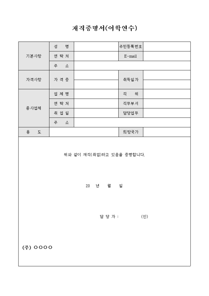 9,000원/월어학연수 시 필요한 재직증명서 양식으로 기본 인적사항과 종사업체의 정보 및 용도 등의 항목을 작성합니다.
