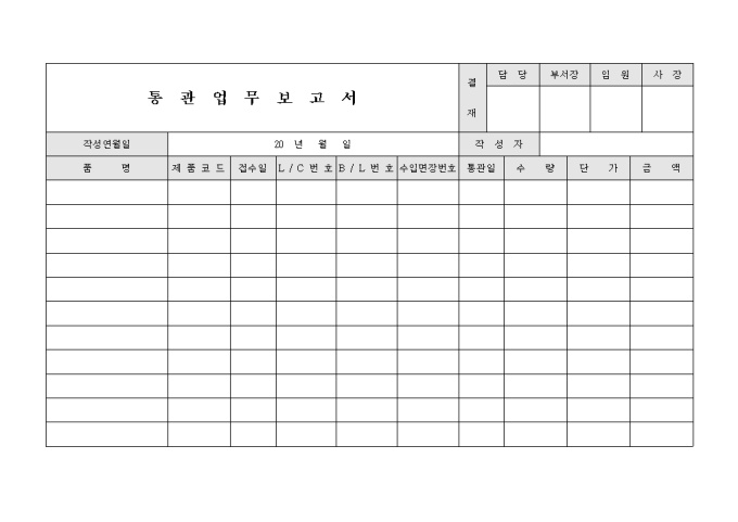 통관 업무에 대해서 보고하고자 할 때 사용하는 서식으로 품명과 제품 코드 및 수입면장번호 등의 항목을 기록합니다.