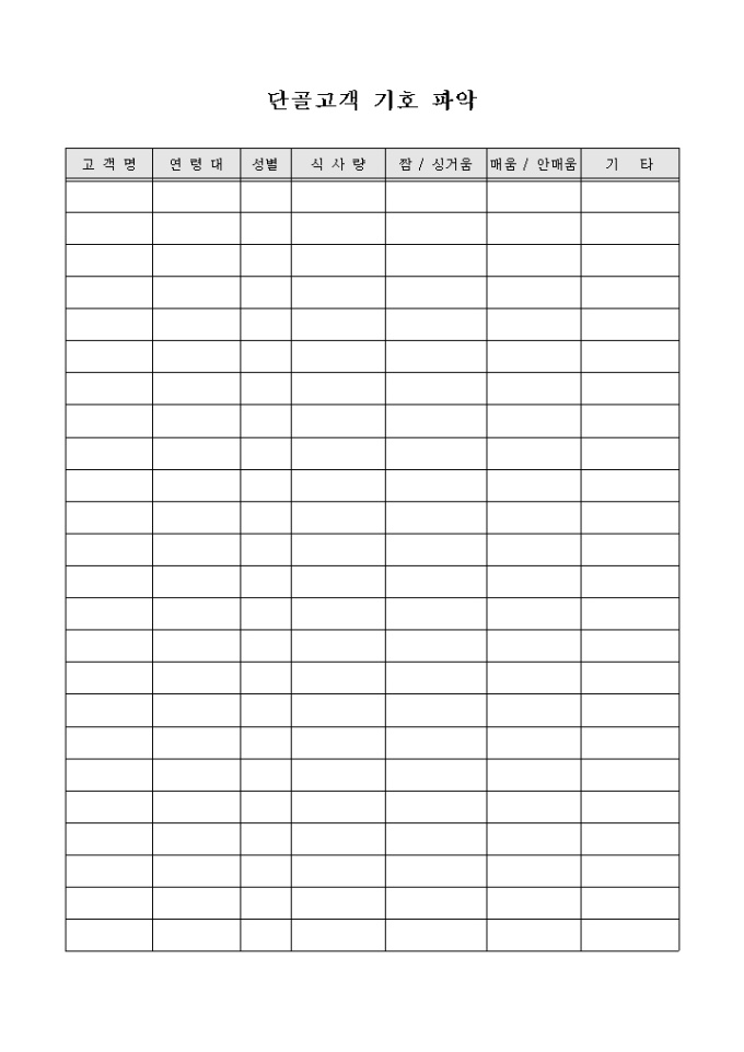9,000원/월식당에 자주 방문하는 단골 고객들의 기호를 파악하여 맞춤형 서비스를 제공하고자 할 경우 사용할 수 있도록 만들어졌으며 식사량, 간 등의 항목을 기입할 수 있게끔 제작된 서식입니다.