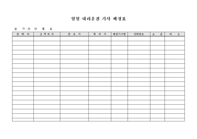 대리운전 회사에서 대리운전 기사 배정현황을 관리하고자 할 경우 사용할 수 있도록 만들어졌으며 고객의 목적지, 비용 등의 정보를 기입할 수 있게끔 제작된 서식입니다.