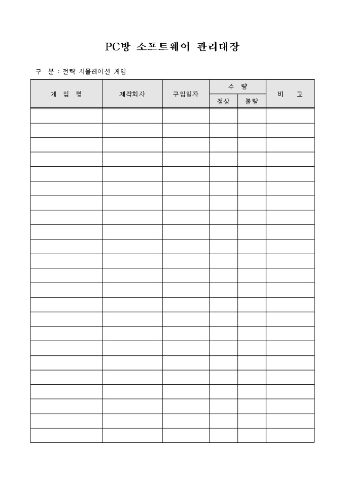 PC방에서 보유하고 있는 소프트웨어를 관리하고자 할 경우 사용할 수 있도록 만들어졌으며 게임유형별 소프트웨어 현황을 기입할 수 있게끔 제작된 서식입니다.