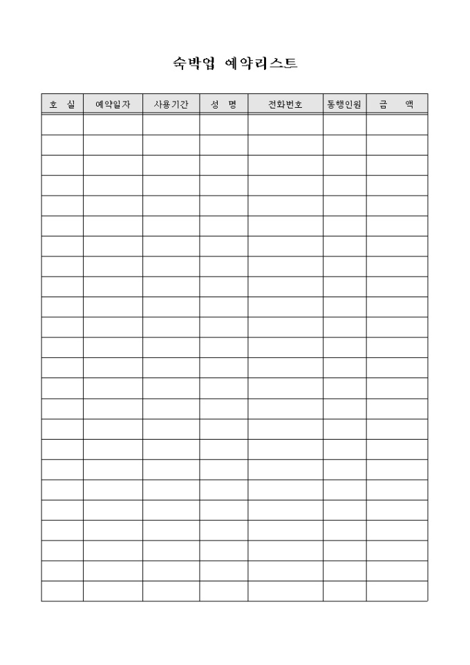 9,000원/월숙박업을 하고 있는 업체에서 고객의 예약현황을 관리하고자 할 경우 사용할 수 있도록 만들어졌으며 동행인원, 금액 등을 기입할 수 있게끔 제작된 서식입니다.
