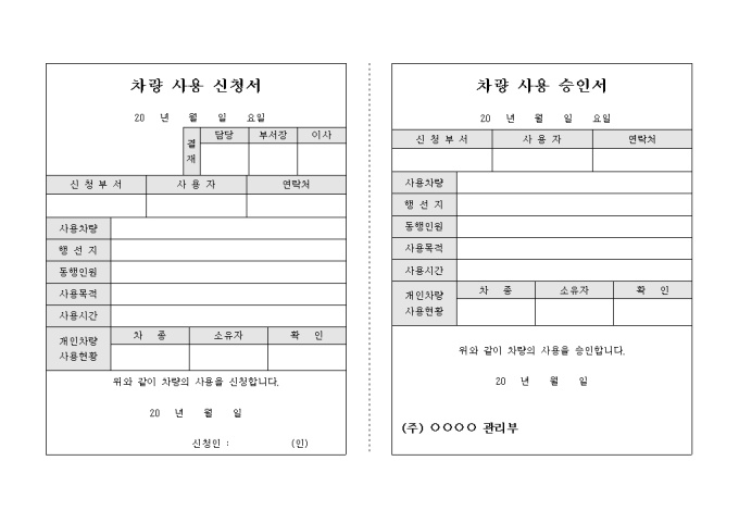 출장이나 외근 등의 업무로 인하여 회사 차량을 사용하고자 할 때 작성하는 차량사용 신청서 양식 및 차량의 사용을 승인하는 승인서 양식입니다.