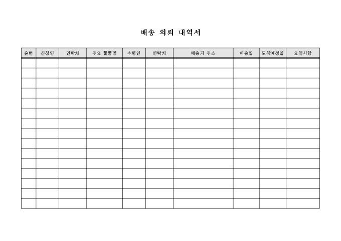 배송을 의뢰한 사항에 대한 내역을 기록하는 배송 의뢰 내역서 양식입니다. 배송을 신청한 신청인 및 연락처, 주요 물품명, 수령인, 배송지 주소, 배송일, 도착예정일, 요청사항 등의 항목으로 구성되어 있습니다.