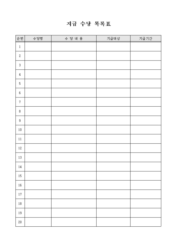 회사에서 지급하는 각종 수당에 대하여 기록할 수 있도록 구성된 지급 수당 목록표 양식입니다. 수당명과 수당내용, 지급대상, 지급기간 등의 항목을 기재할 수 있습니다.